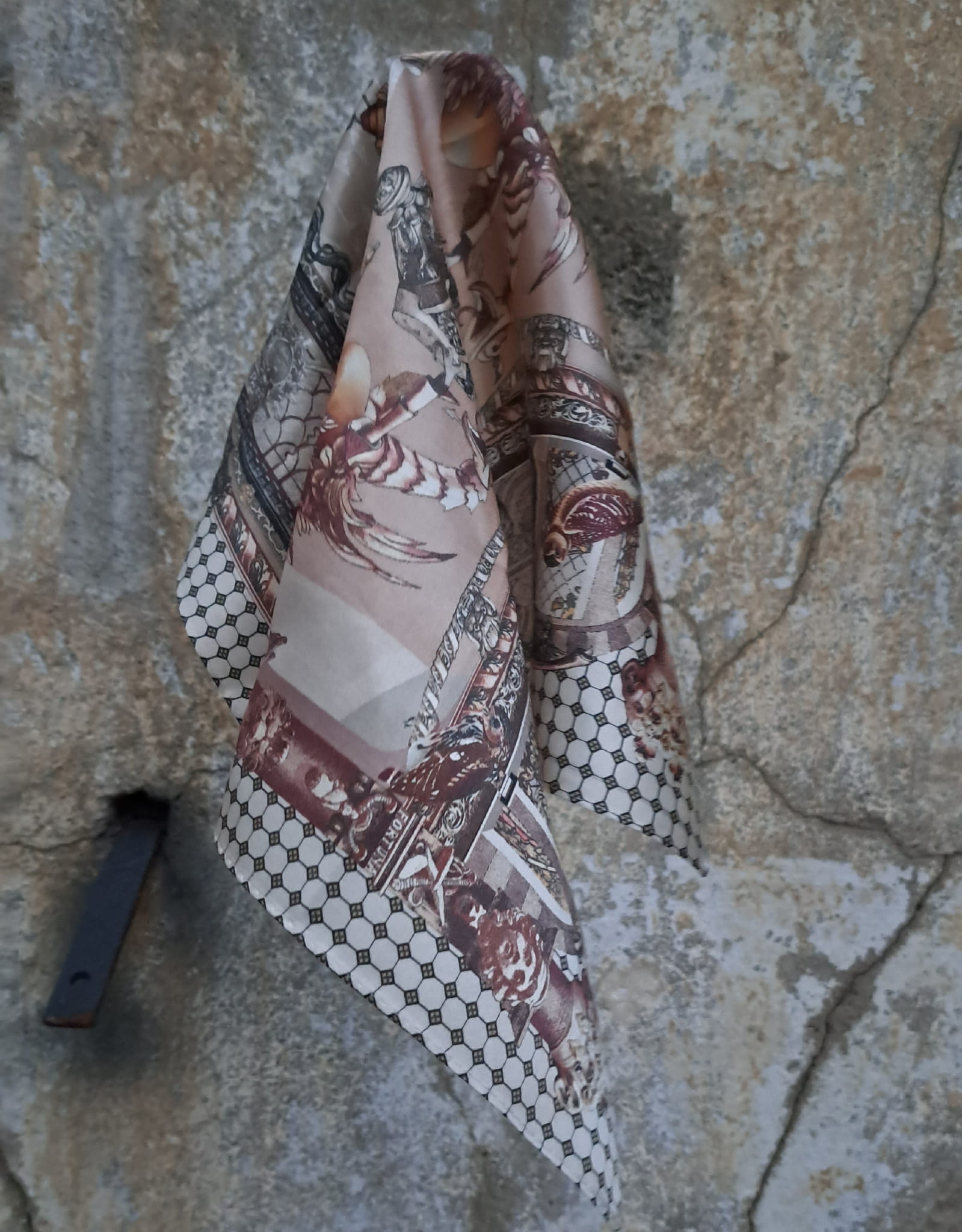 Ten namacalny ślad w połączeniu z historią miasta włókienniczego, zainspirował nas do stworzenia produktu ściśle związanego z tekstyliami. Każda apaszka wraz z zaproszeniem do zwiedzania oraz mapą zawierającą opis detali architektonicznych została wyprodukowana w Polsce. Wspierając polski przemysł chcemy również zatroszczyć się o ślady pozostawione przez architektów XIX i XX stulecia, dlatego 2% dochodu z każdej sprzedanej chusty planujemy przeznaczyć na Fundację ulicy Piotrkowskiej dbającej o zachowanie charakteru ulicy.